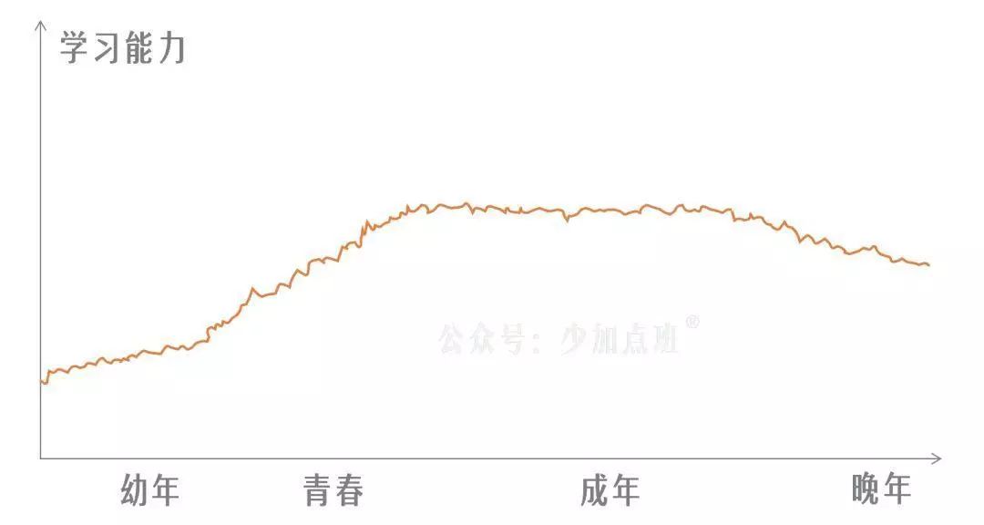 即:幼年到成年,大脑一直在发育,智力跟着提升,而随着“自控力”变强,注意力也随着提升,于是学习能力整体一直在上升,直到成年期,学习能力保持平稳,最后老年了开始衰退。
