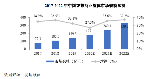 在智慧商业领域,以各类线下消费为主要应用场景,2022年中国智慧商业市场规模将突破329.3亿元,增速将达37.2%。