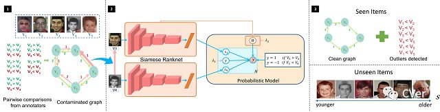 在图像主观视觉属性的估计问题中,由于问题的高度主观性,使用绝对数值进行打分往往会因标注者对打分标准的不同理解而导致获得的标注差别较大,因此学界转而使用通过网络众包收集的成对比较数据进行研究。然而众包数据中通常含有异常样本,使得估计产生较大偏差。为尽可能消除其影响,我们构建了一个鲁棒的深度主观视觉属性预测模型,根据所有标注建立成对比较多重图,即两个顶点间根据不同标注存在多条不同方向的边,而后通过由主观视觉属性预测、异常样本稀疏建模两个协同工作的模块组成的通用深度概率框架对标注进行学习。该方法具有更好的异常样本检测能力,同时也可从极其稀疏的样本标注中进行学习。在人脸属性、人脸年龄和鞋子属性三个预测任务上的实验均表明,提出的模型能进行有效的异常样本检测并显著提升预测性能。