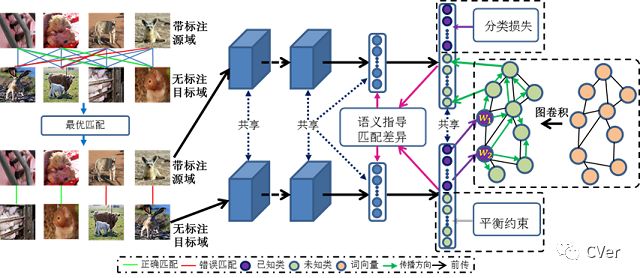针对该问题,我们提出初步解决方案。对于存在未知类,我们通过WordNet构建图卷积神经网络,将已知类的分类规则传播给未知类别,并引入平衡约束来防止训练过程中未知类样本被分成已知类样本。此外,我们先对源域和目标域样本间求一个最优匹配,通过语义一致性来指导对源域与目标域(类别空间不对称)进行域适配。最后我们将分类网络和图卷积网络进行联合训练。实验证明所提方法的有效性。