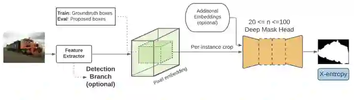 我们考虑了一个类似于 Mask R-CNN 的一般架构系列,与典型的 Mask R-CNN 训练环境相比,存在一个微小但关键的区别:我们在训练时使用实际边界框(而不是建议边界框)裁剪