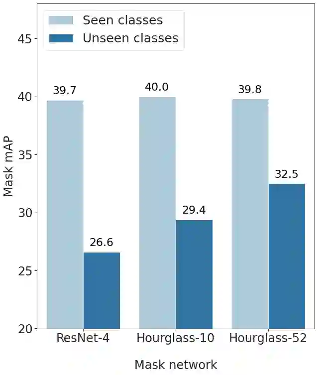 ResNet-4、Hourglass-10 和 Hourglass-52 掩码头部架构在已见类和未见类上的性能。尽管在已见类上的性能几乎没有变化,但在未见类上的性能却有很大差别