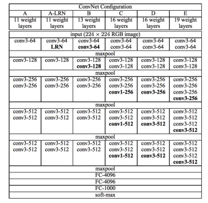 如上图所示,VGG 包含池化层之后的卷积层,池化层负责使层变窄。他们在论文中提出多个此类网络,不同之处在于架构深度的变化。
