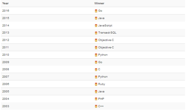 “年度编程语言”获奖名单如下图所示,该奖项授予一年中评分最高的编程语言: