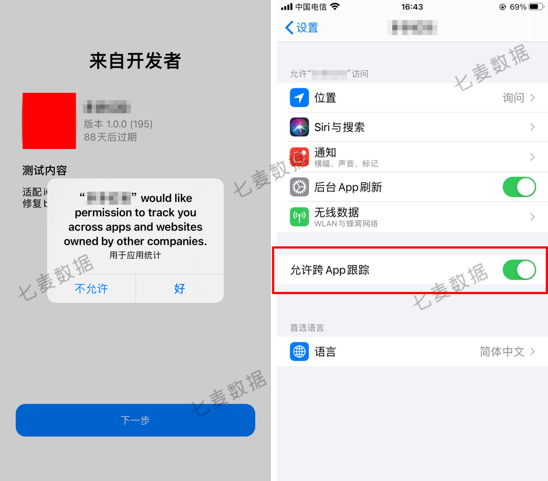 也就是说以后应用需要向用户请求权限,才能跨应用和网站跟踪用户信息。如果用户拒绝授予应用对设备 IDFA 的访问权限,则相当于他已启用了“限制广告跟踪”。