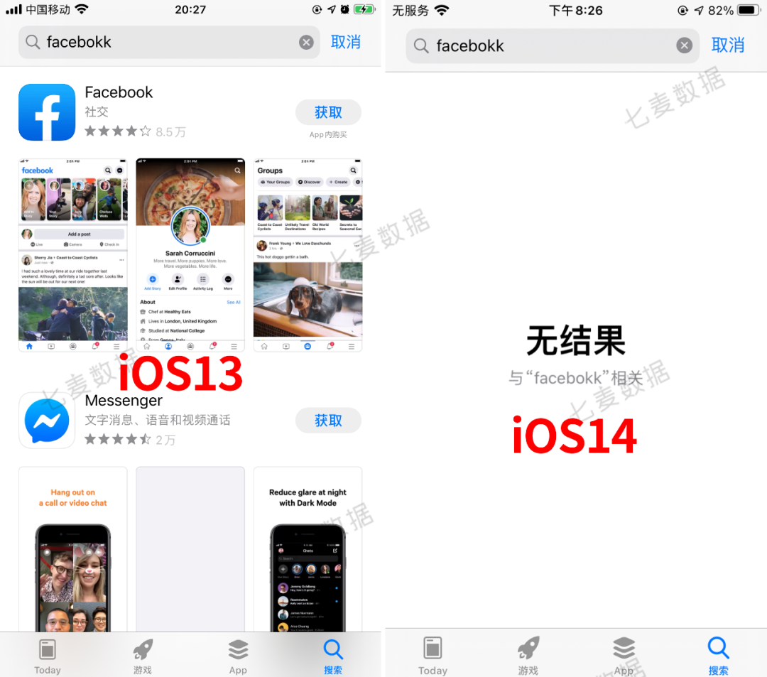 除此之外,我们发现如果不想搜索苹果“自动纠错”的词,而是直接点击下方的提示“要搜索 xxx 吗?,显示的搜索结果会和 iOS13系统不一样。比如搜索 facebokk,会自动纠正成 facebook,如果坚持选择搜索 facebokk,出来的搜索结果会和 iOS13 系统不一样。