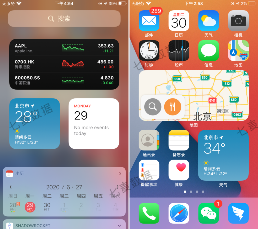 iOS 14 一个值得关注的更新是主屏幕支持Widgets(组件)功能,即苹果允许用户将组件添加到主屏幕中,与 App 一起呈现。并且支持智能叠放、随意摆放。用户可以选择尺寸,有大中小尺寸,并且进行滑动的调用。