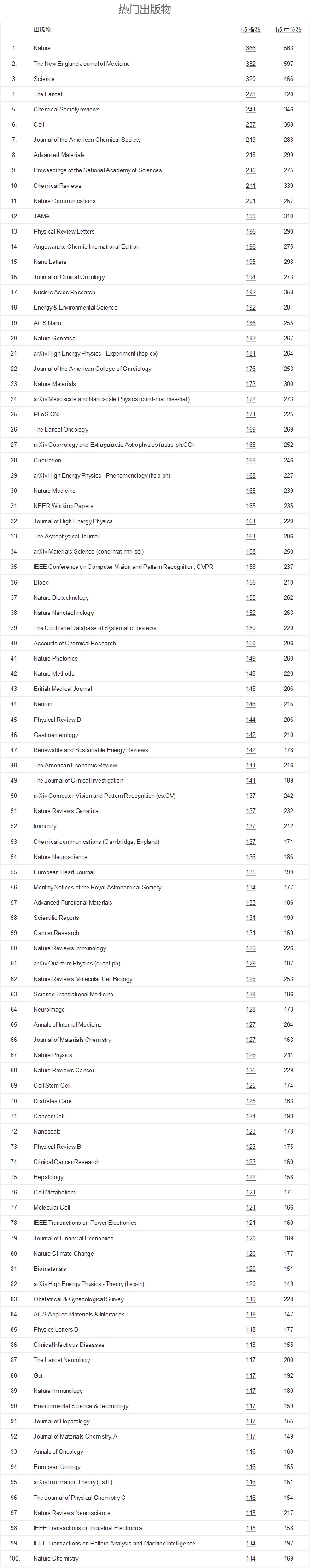 其中,《自然》(Nature)、《新英格兰医学杂志》(NEJM)与《科学》(Science)名列前三。