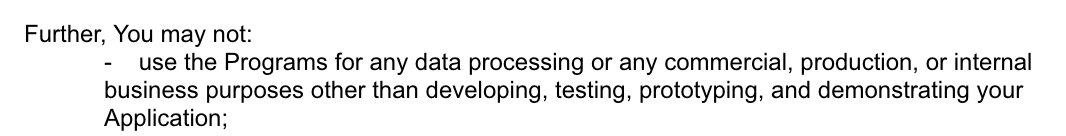 您不能:将程序用于除开发、测试、原型设计和演示应用程序之外的任何数据处理或任何以商业、生产或内部业务为目的的行为;