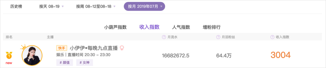 比如 7 月收入榜第一的快手主播@小伊伊 来自黑龙江,一个月直播流水高达 1600 多万元,有过赠送礼物和发送弹幕行为的月活直播观众超过 60 万。