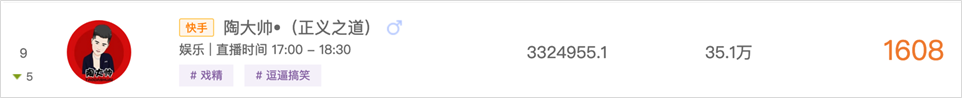来自吉林四平的@陶大帅 ,以直播唱歌、跳舞等才艺为主,常常戏精附体的他具有很强的娱乐属性。