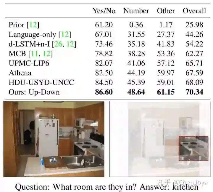 两者结合后的模型称为 Up-Down,以下提供了在 VQA v2.0 上的评测结果,为提交时最高: