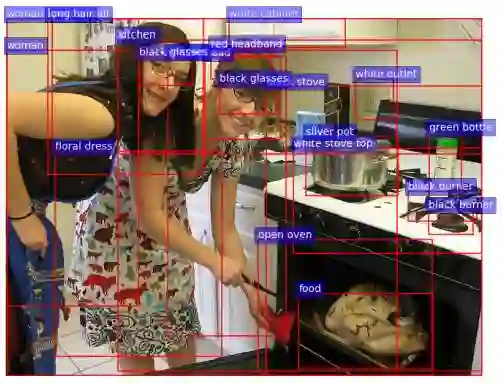 那我们首先来看 bottom-up attention 如何实现。作者采用了基于 ResNet-101 的 Faster R-CNN,添加了 attributes 分支在 VisualGenome 上进行了训练,也正因为如此,Faster R-CNN 能进行更为细致的检测 (图2.2)。在得到图像的预测区域后,再取到这个区域对应的特征(7×7×2048 做一个 mean pooling)。也就是说,在 VQA 模型中是没有用到预测出的标签的,而仅仅使用了该区域的特征。