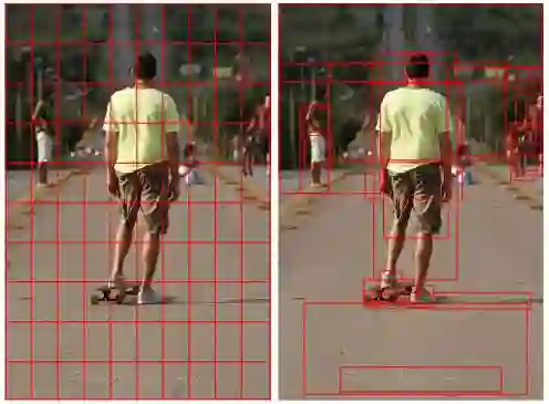 VQA 2017 Challenge 的冠军模型体现在这两篇文章中,我们放在一起介绍。CVPR'18 这一篇是方法论,Tips and Tricks 算是工程实现方面的报告。在方法论中,主打的就是 top-down 和 bottom-up 和两种 attention 机制:前者是指的人会被视觉中的显著突出物体给吸引,是由图像这种底层信息到上层语义的;而后者指的是人在进行某项任务的时候,紧密关注和该任务相关的部分,是由上游任务去关注到图像的。一般的注意力机制就像下图中的左侧显示的那样,是自上而下(top-down)的,表现在依据任务为这些 grid cell 去分配不同的权重,而右侧的注意力机制是自下而上的,从物体层面(object-level)去注意到显著性区域: