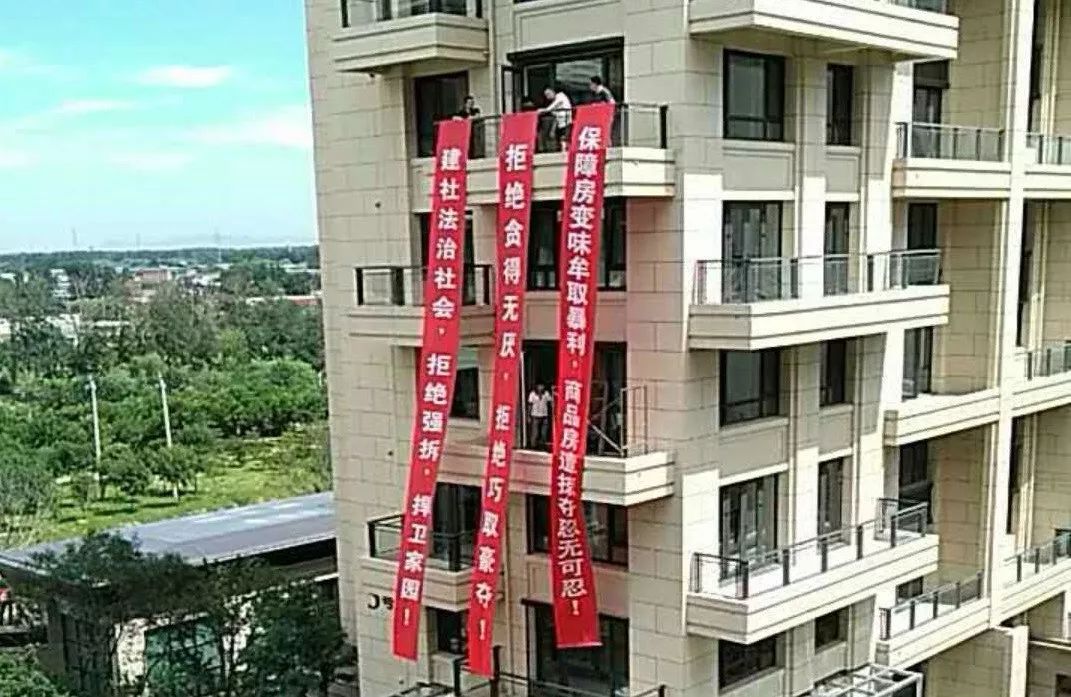 龙湖迫于压力,曾经偷偷把隔离门拆掉,但被商品房业主发现了。他们向龙湖表达了强烈抗议,又把门装上了,还是不放心,稳妥起见,又做了一扇备用门。在面向自住房那边,商品房业主挂出了横幅,上书「保障房变味牟取暴利,商品房遭掠夺忍无可忍」。