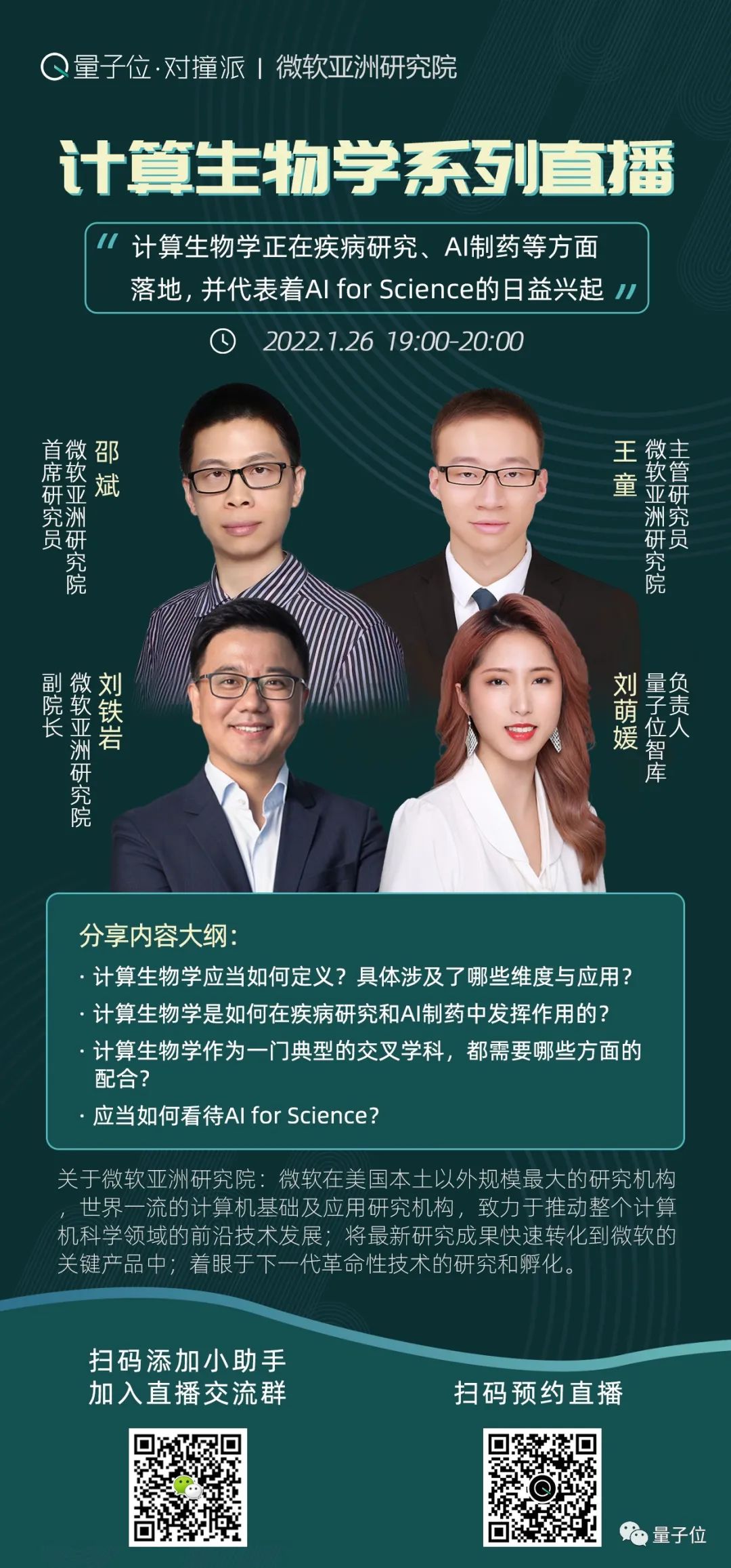 面对全球新冠大流行,AI 能发挥怎样的作用?计算生物学领域还有什么前沿进展值得关注? 随着生物数据等前提条件的成熟,计算生物学得以崭露头角,并在药物靶点预测等领域落地。 传统研究范式之外,以生物学为代表,AI for Science 开始为不同学科带来新的动力。 那么,在 AI 从业者眼中,计算生物学和 AI for Science 又是怎样的?AI 在其中扮演了怎样的角色,又会如何引领未来的发展? 在量子位∙对撞派举办的第三期「计算生物学」直播中,微软亚洲研究院副院长刘铁岩、首席研究员邵斌以及主管研究员王童将介绍他们的所做、所感和所想: 1月26日晚7点到8点,我们在直播间等你。 识别上图右侧二维码即可预约直播、接收开播提醒。