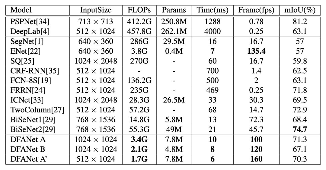 可以说,在计算量受限的前提下,DFANet 是第一个能在高分辨率图片上达到准确度媲美主流“大模型”的轻量化网络。