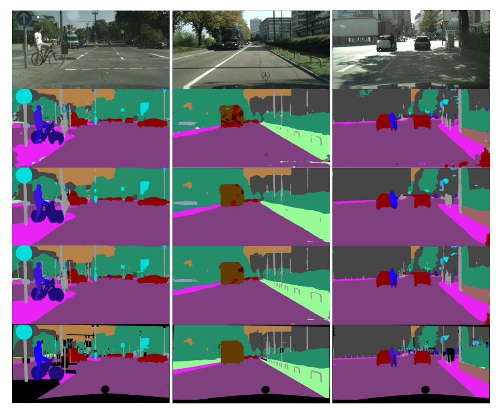 为公平验证 DFANet 的效果,旷视研究院在学术界最常用的分割测试集 Cityscapes 上做了测试。这个数据集是各种最新分割算法的集大成者,尤其是实时分割结果;在其中,输入图片被要求分割为道路、车辆等不同区域,而预测区域与实际区域之间的“平均相交比例”(mIou)被作为评测不同算法的指标。