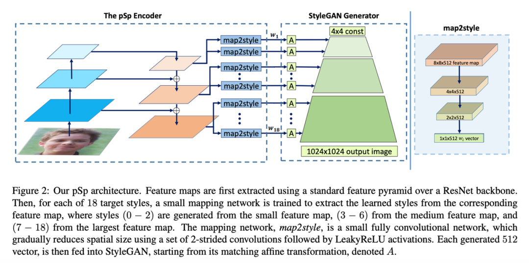 pSp 架构基于预训练 StyleGAN 生成器、W+ 潜在空间构建而成。在 StyleGAN 中,该研究展示了不同风格输入对应于不同层次的细节,这些细节大致分为三组:粗、中、细。于是,研究人员使用特征金字塔 [27] 扩展编码器主干网络,生成三种层次的特征图,它们使用简单的中间网络map2style来提取风格,如下图 2 所示。