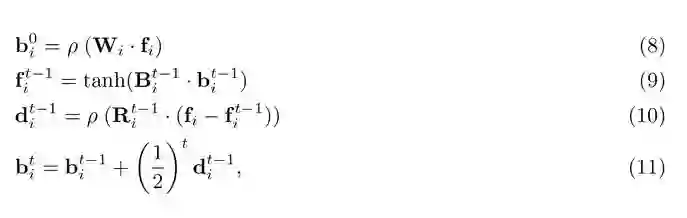 本质上,公式 8-11 背后的关键思想是通过最大化从实值向量 f_i 中提取出的信息来建立二值分解 b_i^t。为了重构这样的二值分解,训练过程中会生成多个中间向量。