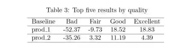 如表 3 所示,在 2000 个查询中,每个查询返回的前 5 个关键词的平均质量为「差」、「一般」、「良」或「优」。表 3 中的每一列代表对应于每列标签的查询-关键词对数量的百分比差距。例如「良」的结果,rbeGIR 系统分别比 prod_1 和 prod_2 高出了 18.52% 和 11.19%。
