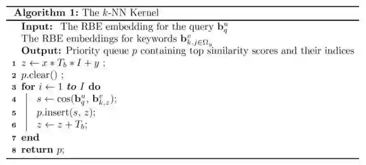 rbeGIR 系统的一个重要组成部分是,可用于十亿级检索的穷举 k-NN 选择算法。该算法从局部的分段处理开始,它依赖于 k-NN 内核(如 Algorithm 1 所示)。该算法将查询和每个关键词的 RBE 嵌入作为输入,并输出一个具有最高相似度得分和索引的优先队列(priority queue)。输出的优先队列被传输给全局选择和合并选择过程,从而获得排序最靠前的关键词。全局选择和合并选择都采用了 Radix 排序方法 [9],这也是最快的排序算法之一。