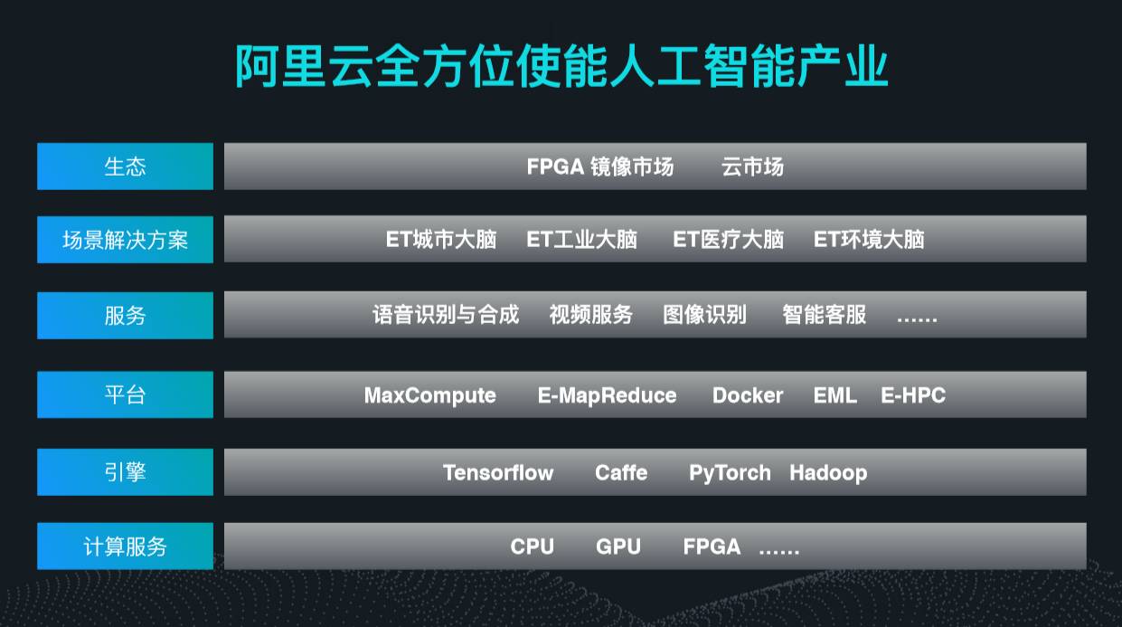 同时,阿里云提供了从产品、服务、生态各维度的人工智能平台服务,满足企业在人工智能领域不同层次的需求,比如用户可以在阿里云异构平台上快速搭建TensorFlow深度学习框架,同时调用视频识别、图像识别、语音识别等服务,开发出类似ET工业大脑、环境大脑的应用服务,这跟此前需要东拼西凑还要运维的创业方式相比,体验和效率完全不同。