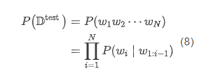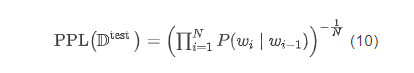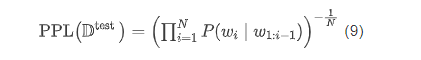 困惑度则为模型分配给测试集中每一个词的概率的几何平均值的倒数: