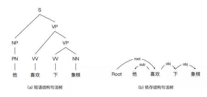 典型的句法结构表示方法包含两种——短语结构句法表示和依存结构句法表 示。它们的不同点在于依托的文法规则不一样。其中,短语结构句法表示依托上 下文无关文法,属于一种层次性的表示方法。而依存结构句法表示依托依存文法。