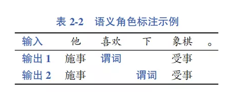 其中,语义角色标注也称谓词论元结构(Predicate-Argument Structure),即首先识别句子中可能的谓词(一般为动词),然后为每个谓词确定所携带的语义角 色(也称作论元),如表示动作发出者的施事(Agent),表示动作承受者的受事 (Patient)等。除了核心语义角色,还有一类辅助描述动作的语言成分,被称为附加语义角色,如动作发生的时间、地点和方式等。表 2-2 展示了一个语义角色标注的示例,其中有两个谓词——“喜欢”和“下”,并针对每个谓词产生相应的论元输出结果。