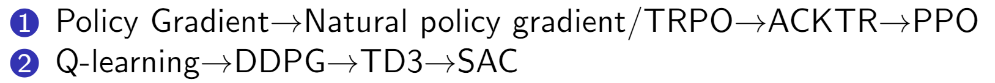 第六课依然是讲策略优化,不过难度上了一个台阶。在这堂课中,周老师主要介绍了策略梯度算法的不同变种以及近五年来最新的策略优化过程。其中,后者可以分为两条主线,涵盖强化学习中最有名的六种算法: