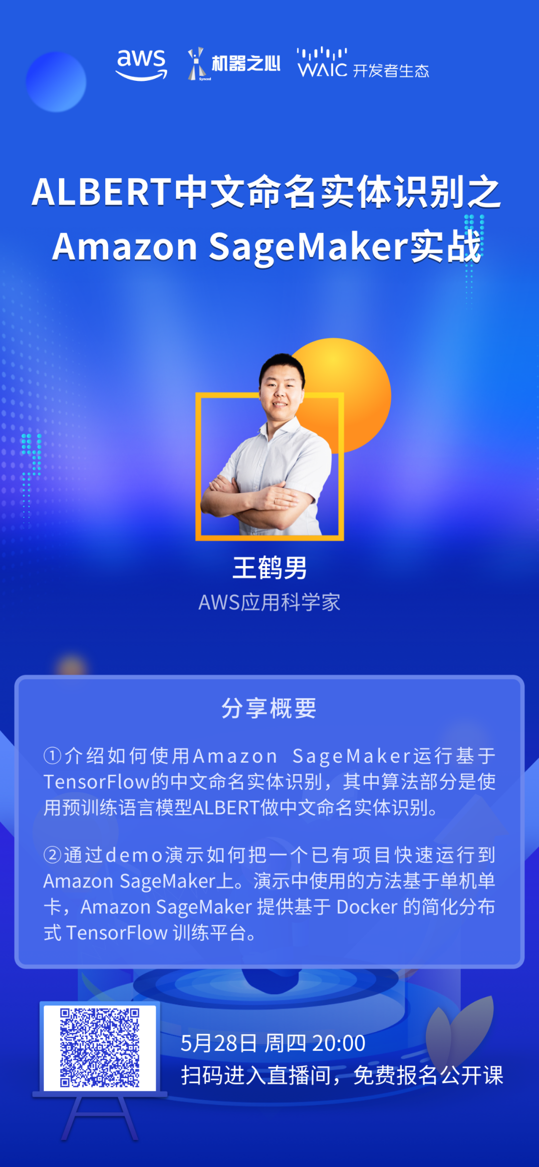 5 月 28 日 20:00,AWS 应用科学家王鹤男带来第 2 课,详解如何使用 SageMaker 运行基于 TensorFlow 的中文命名实体识别。识别二维码,立即预约直播。