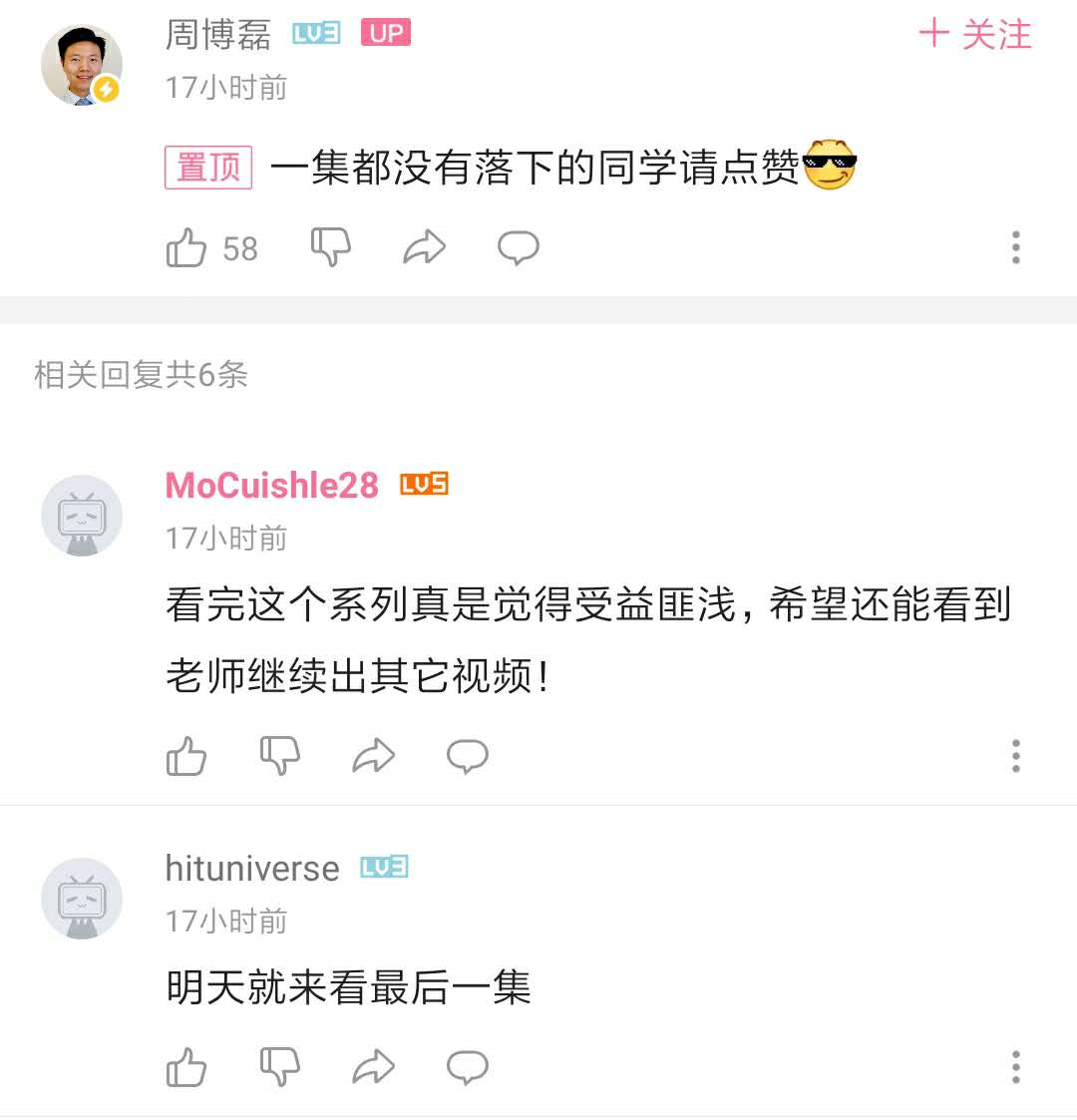当然,由于课程比较难,大家难免有疑问。如果你在本课程学习期间遇到了问题,可以到 B 站视频的评论区留言,周老师会尽量作答,也会有热心的同学帮忙回答。