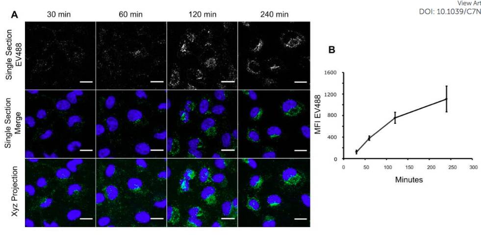 图:maleimide-Alexa488染料结合EV硫醇基团,实现EV内吞作用的可视化