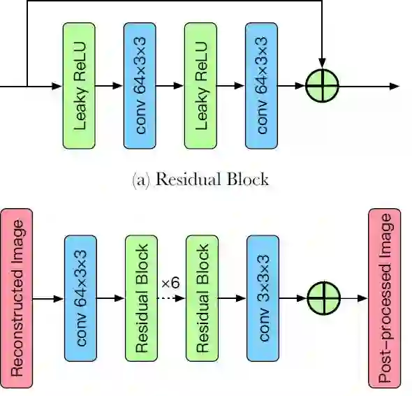 低码率压缩算法重建图最显著的缺点是存在伪影,并且很多纹理细节会丢失。为了改进在低码率条件下重建图的质量,我们设计一个有效的后处理模块,后处理模块的具体细节如图 3 所示。