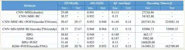 我们的方法参加了 CVPR 2018 CLIC 图像压缩挑战赛,在相应的验证集和测试集上的结果如表 1 所示。我们的算法 tucodecTNGcnn4p 取得了 MS-SSIM 和 MOS 两项指标排名第一,算法 tucodecTNG 取得了 PSNR 指标排名第二的成绩。在验证集和测试集上的实验结果如表 1 所示。