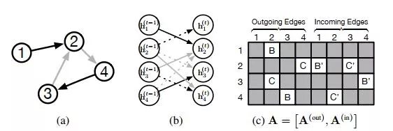 相比于GNN,GGNN的特点在于使用了门控单元来控制信息的传播,比如可以用GRU,LSTM等门控方式来传递图的信息而且,节点表示的更新次数被固定成了 。也就是说,GGNN并不能保证图的最终状态会到达不动点。由于更新次数