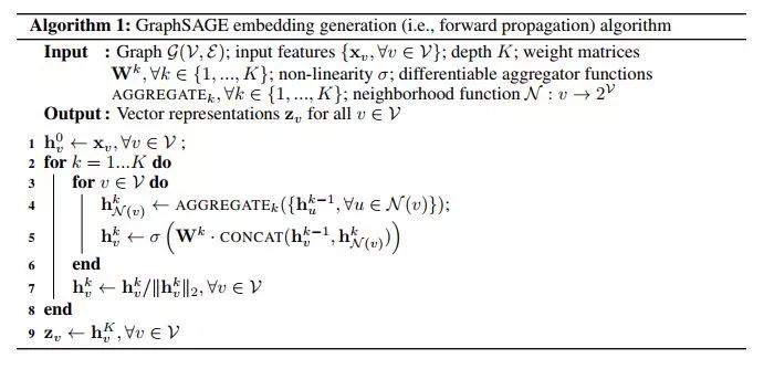GraphSAGE框架的核心是如何聚合节点邻居特征信息来对当前节点特征进行更新,下文介绍GraphSAGE前向传播过程(生成节点embedding)和不同的聚合函数设定。
