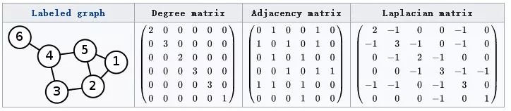 其中,D:Degree matrix 图中节点的度矩阵(对角矩阵,对角线上元素为各节点的度)