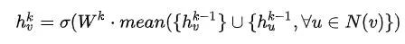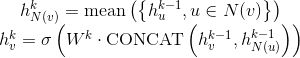b. 归纳式聚合:直接对目标节点和所有邻居emebdding中每个维度取平均(替换伪代码中第5、6行),后再非线性转换: