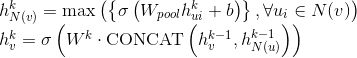 d. Pooling聚合器: 先对每个邻居节点上一层embedding进行非线性转换(等价单个全连接层,每一维度代表在某方面的表示(如信用情况)),再按维度应用 max/mean pooling,捕获邻居集上在某方面的突出的/综合的表现 以此表示目标节点embedding。