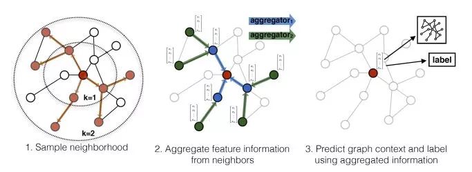 下图是GraphSAGE 生成目标节点(红色)embededing并供下游任务预测的过程: