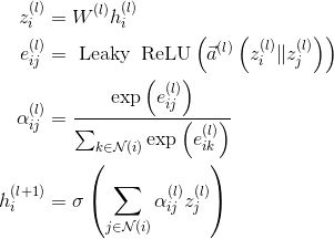 图注意力模型 GAT 用注意力机制替代了GCN中固定的标准化操作。以下公式定义了如何对第 l 层节点特征做更新得到第 l+1 层节点特征: