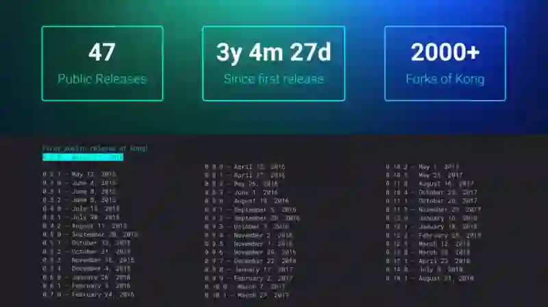 自从四年前开源 Kong 以来,来自世界各地的数百名贡献者对 Kong 代码库进行了无数次的改进,这些改进让我们迎来了 1.0 版本。我们十分感谢 Kong 的用户和贡献者。我们最初在开源 Kong 时,并没有想到它的社区会有如此惊人的增长,并且一直在持续!