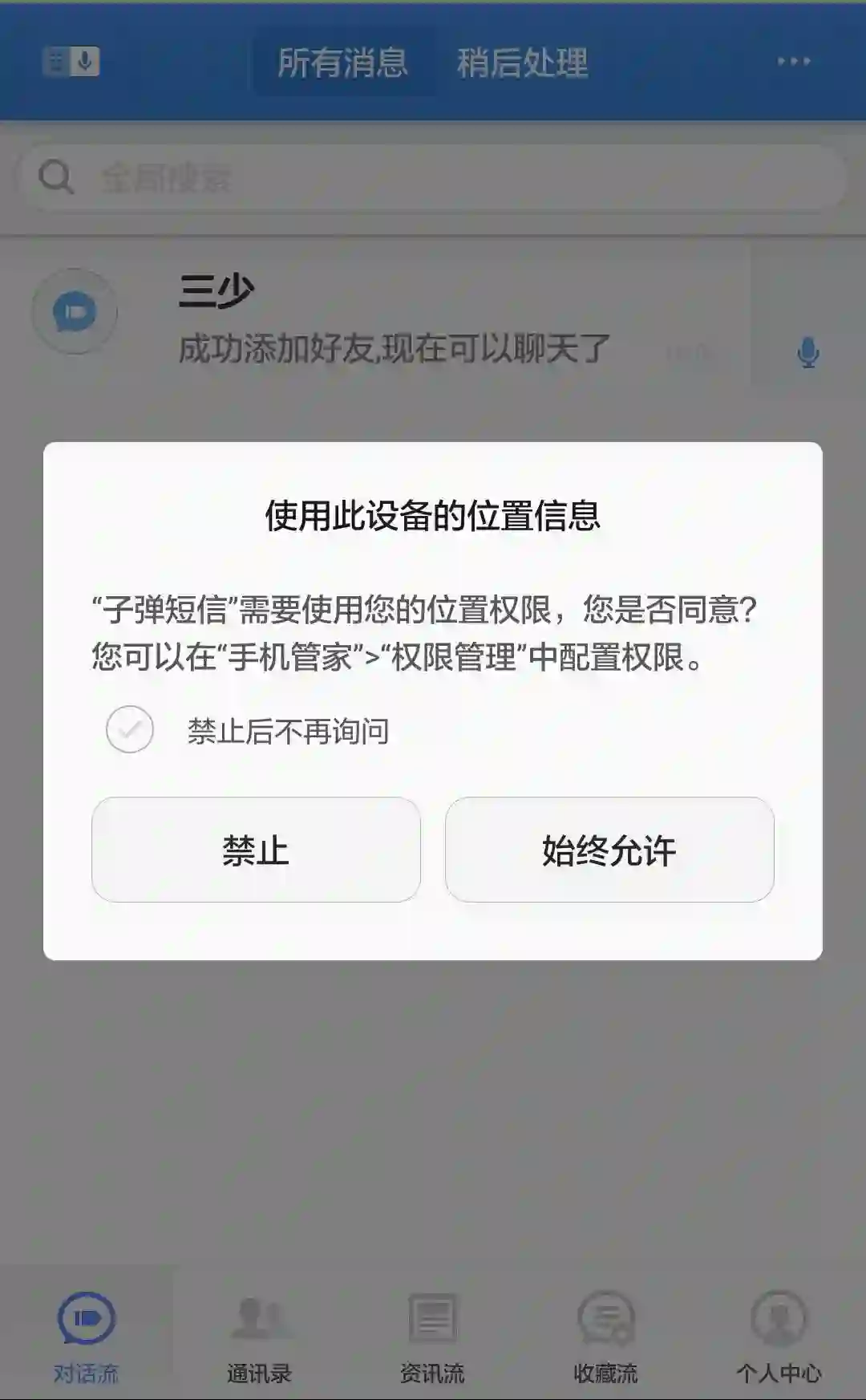 和很多人一开始反应的“默认读取通讯录”不一样,邦哥在进入软件时,得到了一系列获取权限的系统提示,只要选择拒绝,软件并不会自动读取手机通讯录或者地理位置等隐私信息。