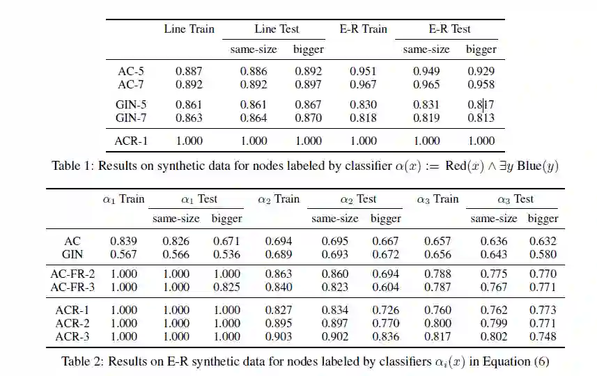 为展现理论上证明的 ACR-GNNs 的表现力和 AC-GNNs 与 ACR-GNNs 的区别,作者选择在合成数据集上进行实验,具体如下:一个展现 ACR-GNNs 可以学习到而 AC-GNNs 不能学习到的一个简单的 FOC2 节点分类器的实验和一个涉及到更加复杂的 FOC2 分类器去学习更多直接相关的 readout 函数的实验。