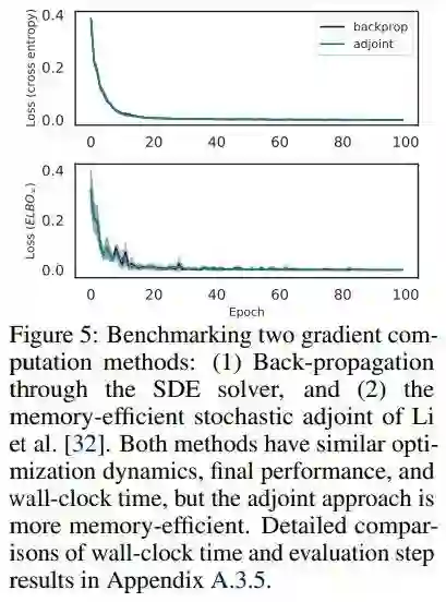 为了对比求解器与 adjoint 的反向传播,研究者比较了固定和自适应步长的 SDE 求解器,并比较了 Li 等人提出的随机 adjoint 之间的比较, 图 5 显示了这两种方法具有相似的收敛性: