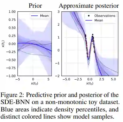 该研究首先验证了 SDE-BNN 在 1D 回归问题上的表现。以弥散过程的样本为条件,来自 1D SDE-BNN 的每个样本都是从输入到输出的双向映射。这意味着从 1D SDE-BNN 采样的每个函数都是单调的。为了能够对非单调函数进行采样,该研究使用初始化为零的 2 个额外维度来增加状态。图 2 显示了模型在合成的非单调 1D 数据集上学习了相当灵活的近似后验。