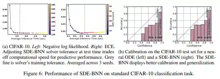 图 6a 展示了 SDE-BNN 的性能,图 6b 显示具有相似准确率但比神经 ODE 校准更好的结果。
