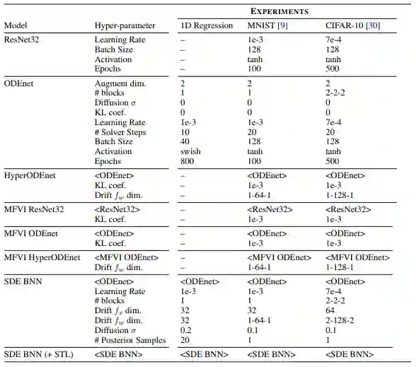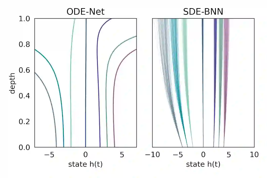 具体来说,该研究考虑了无限深度贝叶斯神经网络每层分别具有未知权重的限制,提出一类称为 SDE-BNN(SDE- Bayesian neural network )的模型。该研究表明,使用 Li 等人(2020)描述的基于可扩展梯度的变分推理方案可以有效地进行近似推理。